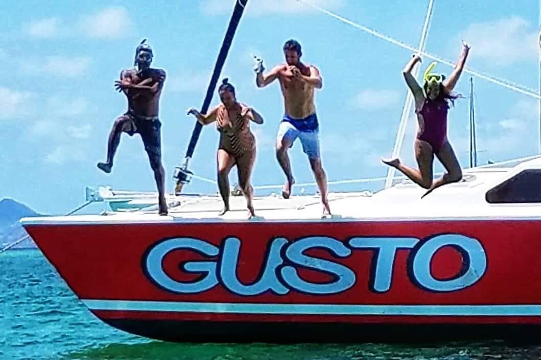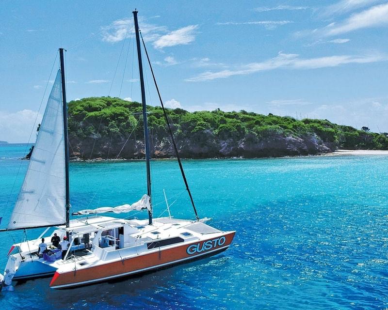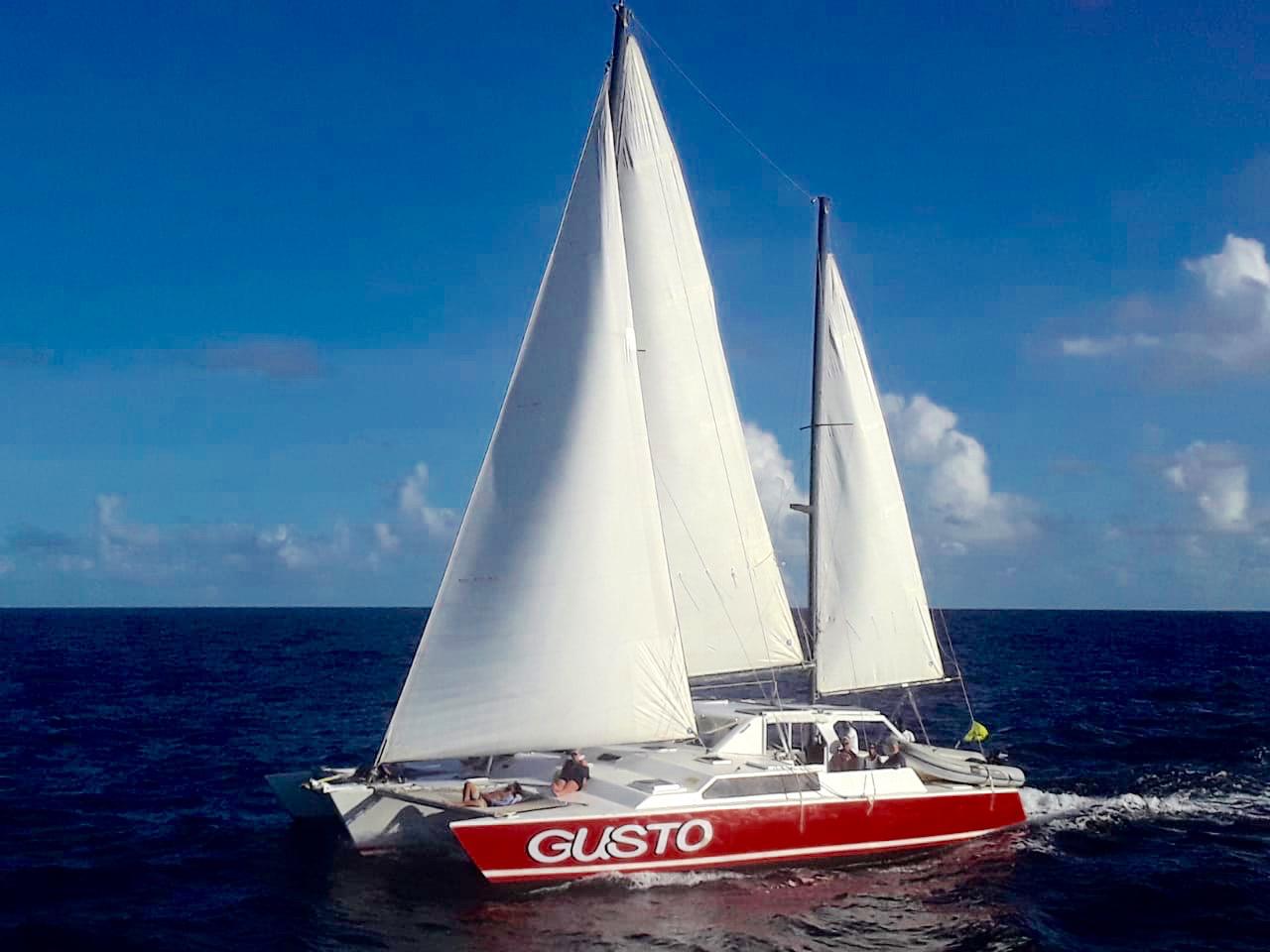 is a 54' Trimaran in Bequia, Saint Vincent and The Grenadines, and ready to set sail for your pleasure, ease, and next great adventure! Gusto's available for day sails & custom charters. Our large, and spacious center deck with multiple cushioned seating areas allow for couple to group sails of up to 16 passengers. The bow features a net, ideal for lounging with a cold beverage, the waves beneath you and blue skies above. One bar counter is ready to serve you refreshing beverages all day. Gusto has bathrooms on board, and plenty of storage space for any gear.